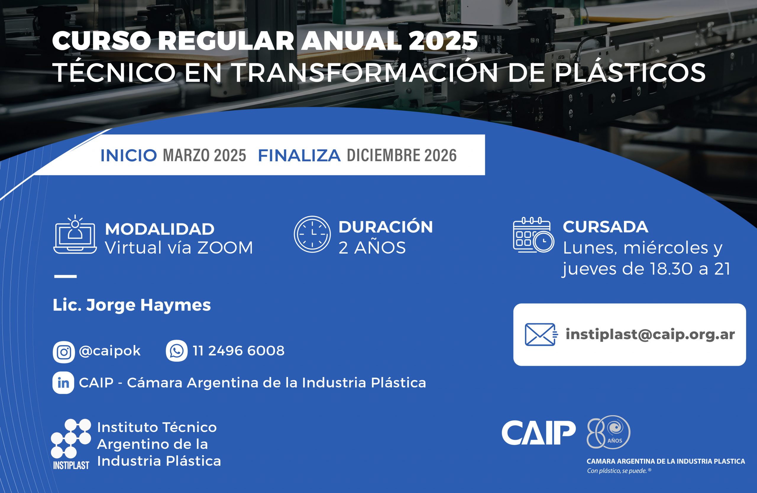 Formación técnica del personal que pueda desempeñarse como especialista en procesos de transformación de materiales plásticos, con capacidad para perfeccionar la producción y desarrollar nuevos productos con una correcta aplicación de los materiales adecuados a cada destino.instiplast@caip.org.ar / whatsapp: 11 2496 6008